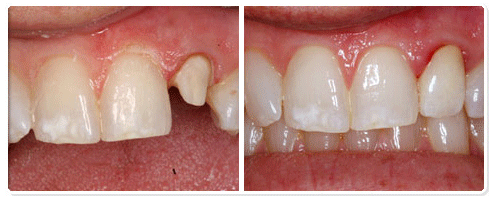 The tooth is grinded down at least one millimeter in circumference and shortened with at least two millimeters. A metal free porcelain crown is then cemented in place.