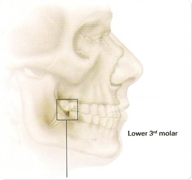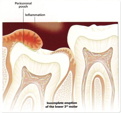The following picture shows a partially erupted wisdom tooth. Note the little piece of gum overlapping the crown. This is the trigger for localized and widespread infection.