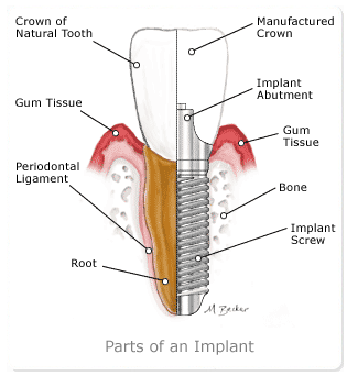 The picture on the left shows how an implant mimics the anatomy and function of a natural tooth.