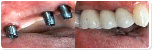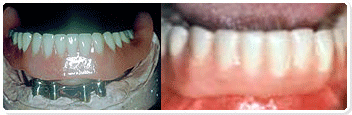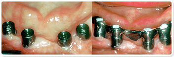 Fastening dentures to the jaw. This is an excellent solution for those of you who are struggling with lose dentures and has been embarrassed by them. These dentures are still removable by the patient. Special oral hygiene methods apply (see oral hygiene page)